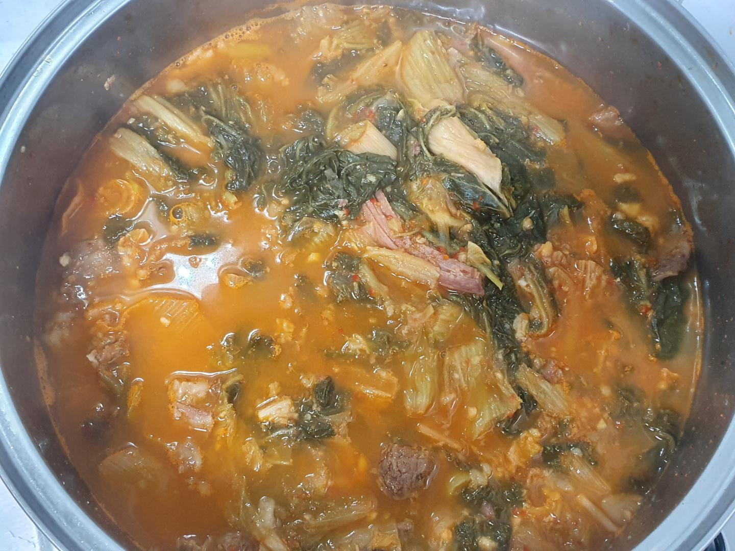 중간에 사진을 안 찍었네요... 주말농장에서 부모님께서 열심히 기른 배추... 병들어서 김장 못하고 그냥 우거지가 되었습니다. 우거지, 고춧가루, 생강, 마늘, 간장게장/새우장의 간장, 들깻가루, 후춧가루를 넣고 무쳐서 하루 냉장고에 재워뒀던 것을 국물에 넣어줬습니다. 그리고 양지는 찢어서 넣어주고, 잡뼈에 붙어있던 고기 바른 것도 넣고 끓였습니다. 게간장이 좋네요. 1시간 끓이고 2시간 방치 후 다시 1시간 끓였습니다. 너무 오래 끓이면 우거지가 다 흐물흐물해집니다.