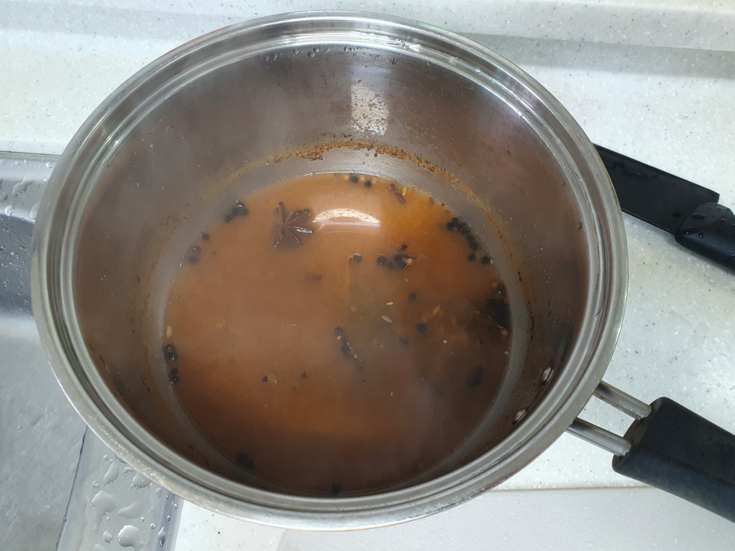 향신료는 그냥 집에 있는 거 대충... 팔각(저는 팔각향 안 좋아하지만.. 없으면 섭섭하니 1개만... 이거 향 엄청 강합니다. 그래도 완성될 때쯤엔 약해집니다.), 피클링 스파이스 (정향, 코리엔더, 겨자, 계핏가루 약간(많이 넣으면 냄새 이상)), 후추, 생강, 큐민, 펜넬 씨, 페페론치노(마른 고추 아무거나), 마조람, 바질, 중국 산초, 에 또 뭐 더 넣은 게 있던가... 아무튼 절대 넣으면 안 될 거 제외하고 이것저것 많이 넣었습니다. 향신료는 그냥 10분 정도 조금만 끓였습니다.