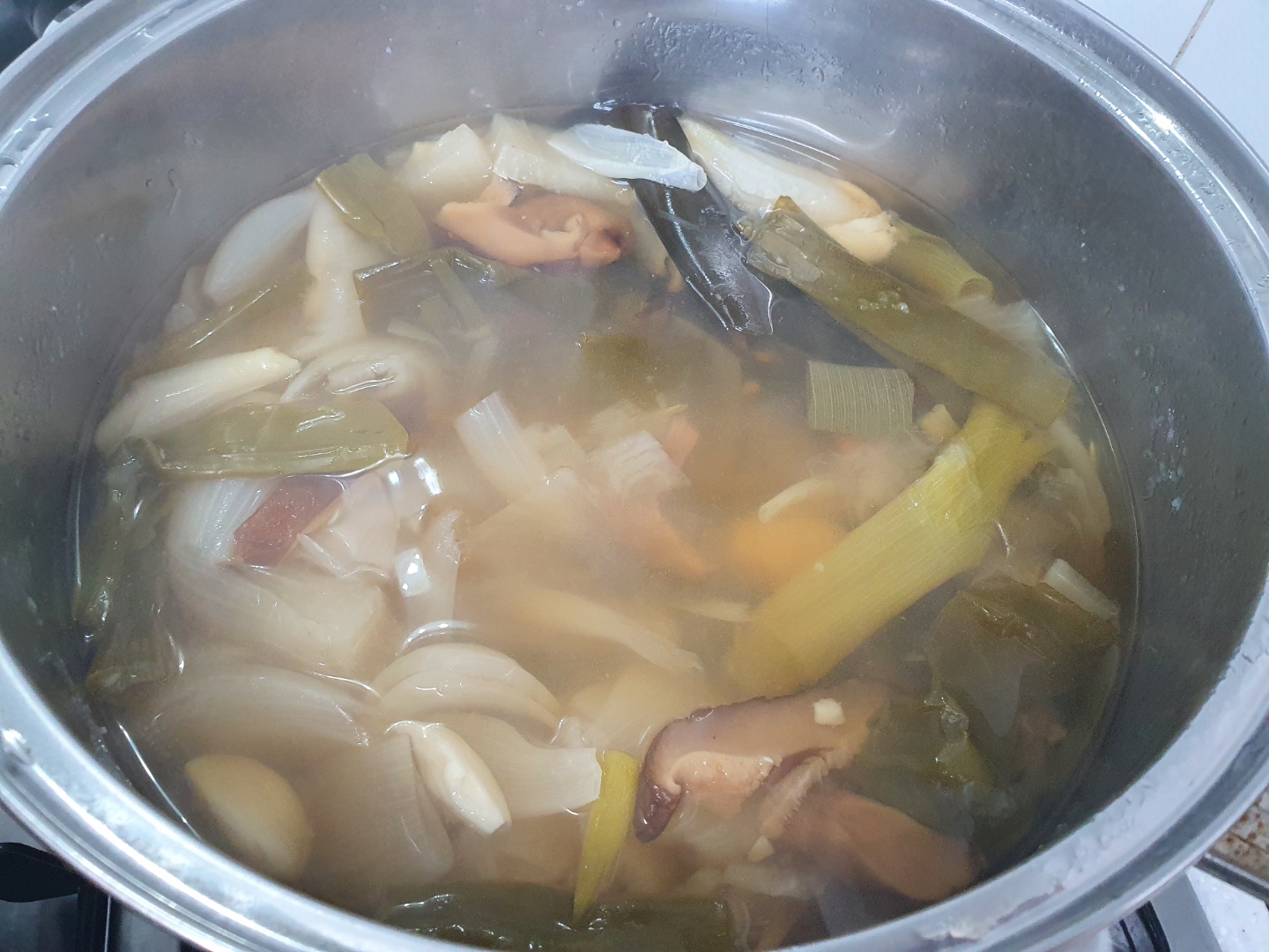 일단 채소와 향신료를 먼저 끓여줍니다. 채소는 양파, 무, 파, 마늘, 말린 표고버섯, 다시마입니다. (한국인에게 마늘은 향신료가 아닙니다.) 양파에서 단맛이 나오도록 한 시간 이상 끓였습니다.