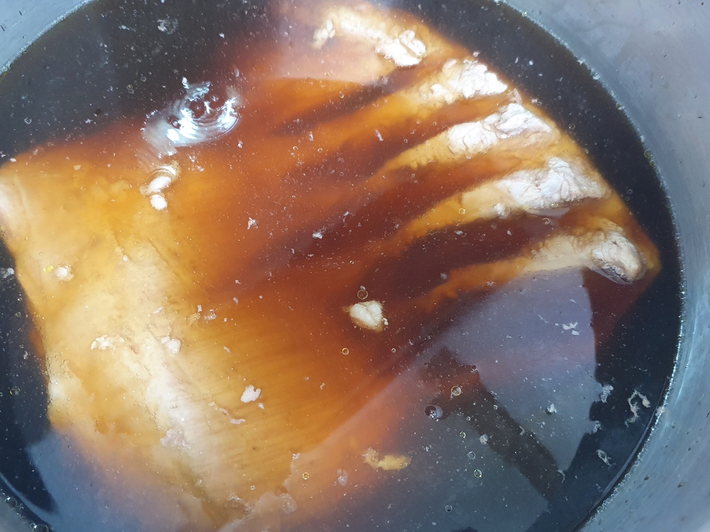 고기를 반으로 잘라서 냄비에서 10분 정도 데친 후, 오븐에서 200도로 20분 정도 구웠습니다.
