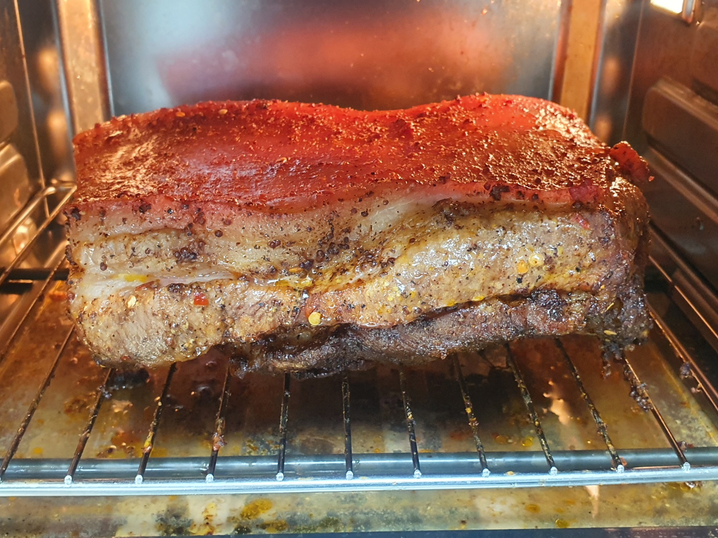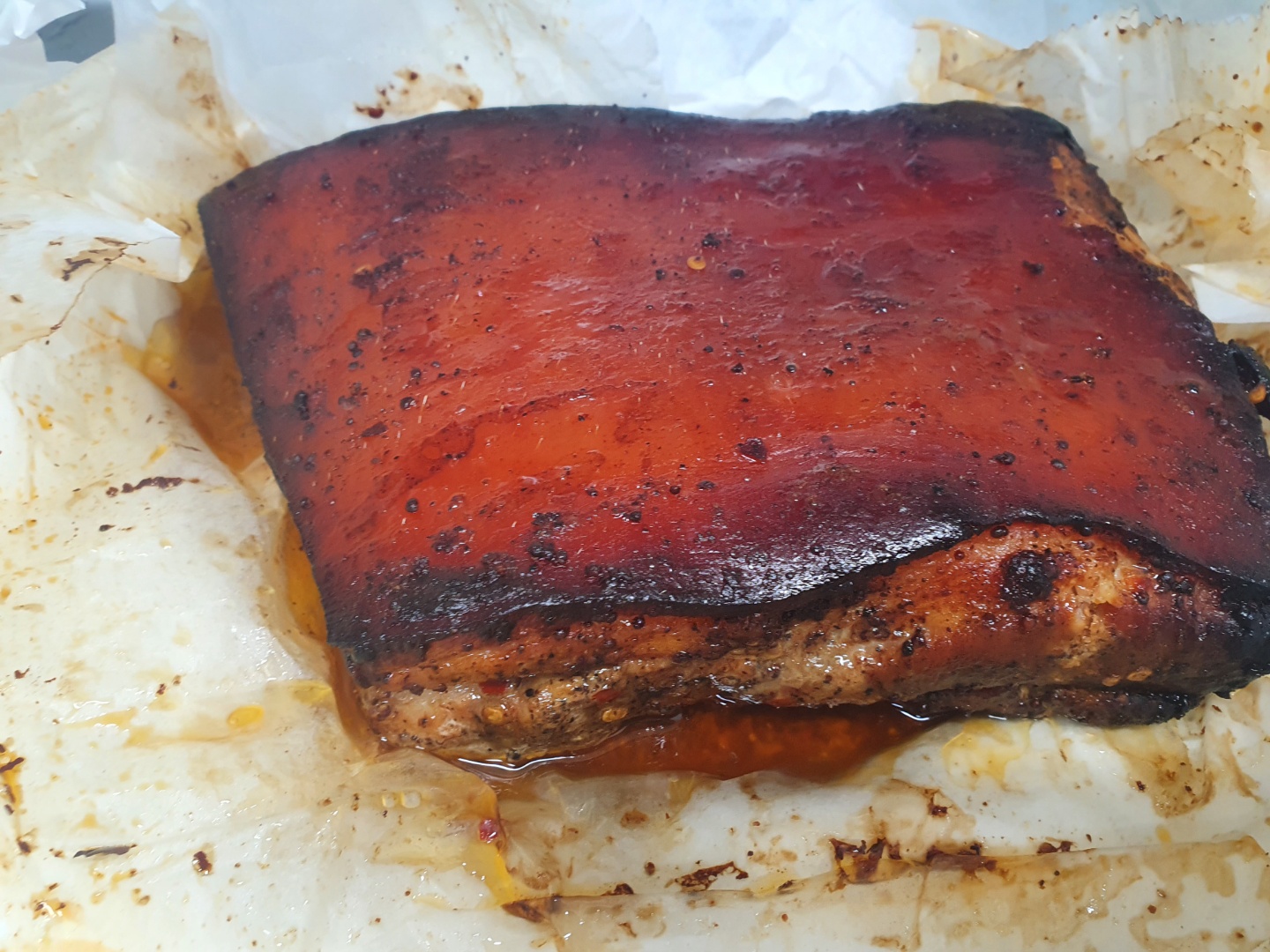 2시간 후에 꺼내서 종이 포일에 싸서 2차로 120~150도에서 4시간 정도 구워줍니다. 지방에 열을 가해서 녹여야 하니 껍질이 있는 부위를 위로 향하게 합니다. 목표 심부온도는 90도 이상입니다. 심부 온도계를 꽂을 때, 저항 없이 쑥 들어가면 잘 익은 것입니다. 1시간 정도 레스팅 합니다.
