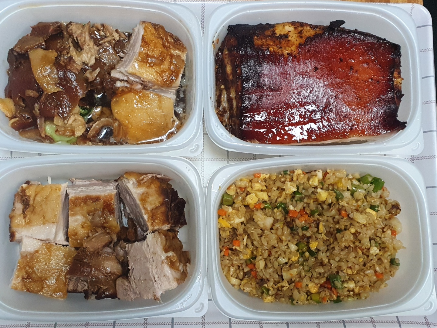 내일 직장에 가져갈 도시락을 만들었습니다. 동파육, 청경채, 풀드 포크, 새우 볶음밥입니다.