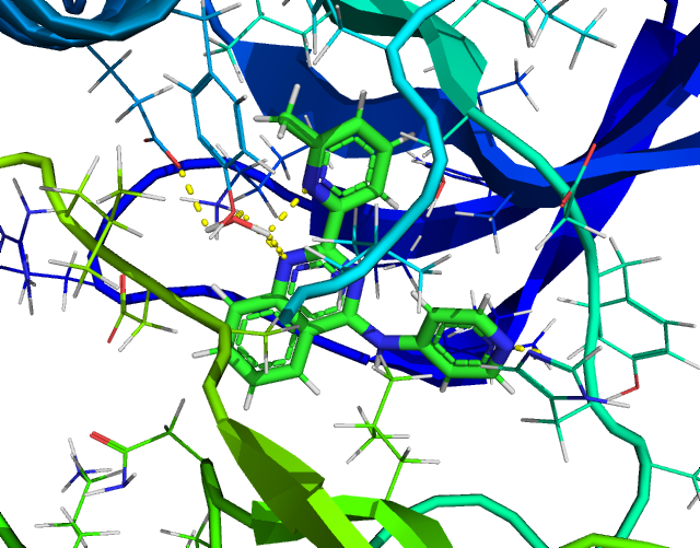 3HMMA 855 TGFR1과 855 ligand의 상호작용입니다. 다른 리간드들도 유사하지만, 이 타겟에 대한 inhibitor들의 결합구조에선 수소결합의 기여가 크지 않습니다. 다만 물분자와 수소결합을 하는 것처럼 보입니다. 여러 ligand들이 물분자와 인접한 곳의 ring에 수소결합이 가능하도록 질소 원자를 가지고 있습니다.