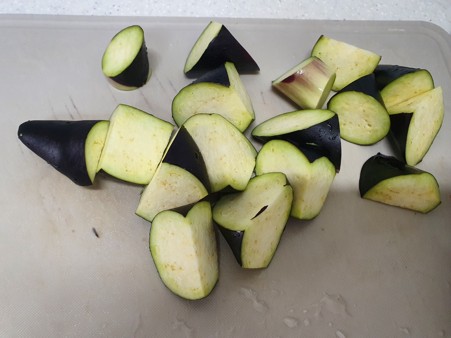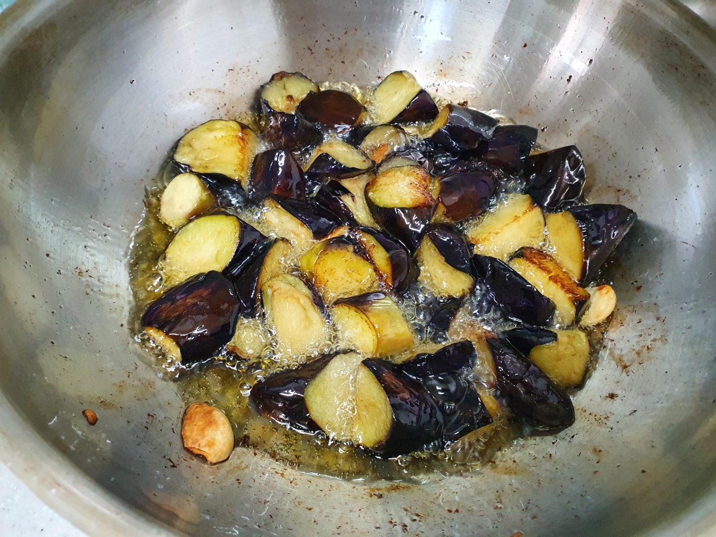 가지를 적당히 썰어서 기름에 튀깁니다. 기름을 많이 넣지 않으면 죄다 가지에 흡수당해서 기름이 전부 사라집니다... 하지만 익으면서 다시 배출됩니다. 그래도 많이 넣고 제대로 튀겨지도록 하는 것이 맛있습니다. 제대로 안튀겨지면 별로입니다. 완전히 흐물흐물할 때까지 튀겨야 합니다.