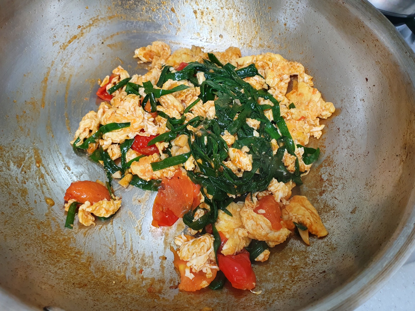 그냥 하는 김에 (냉장고에 부추가 남아서) 만든 계란 토마토 볶음입니다.