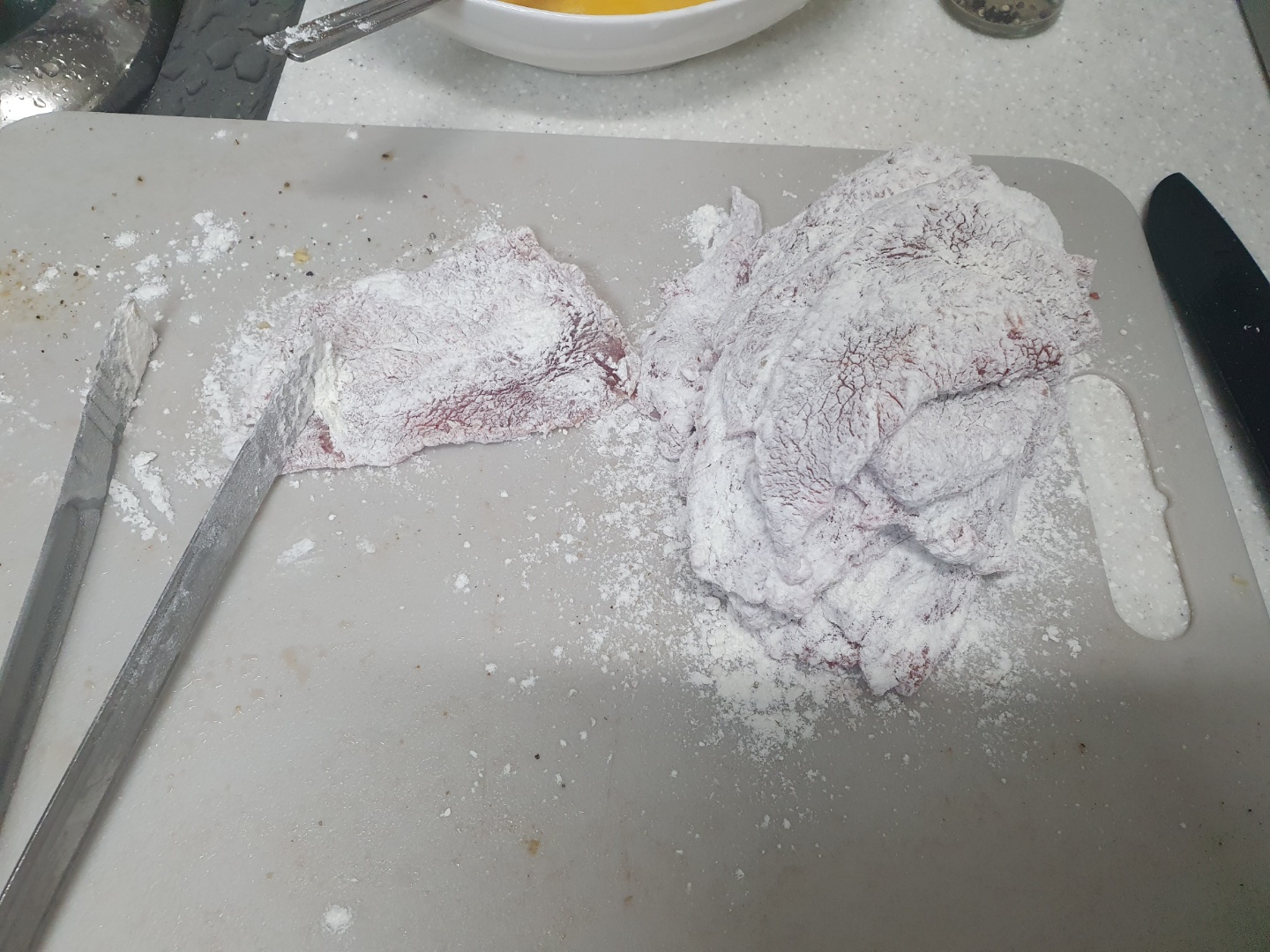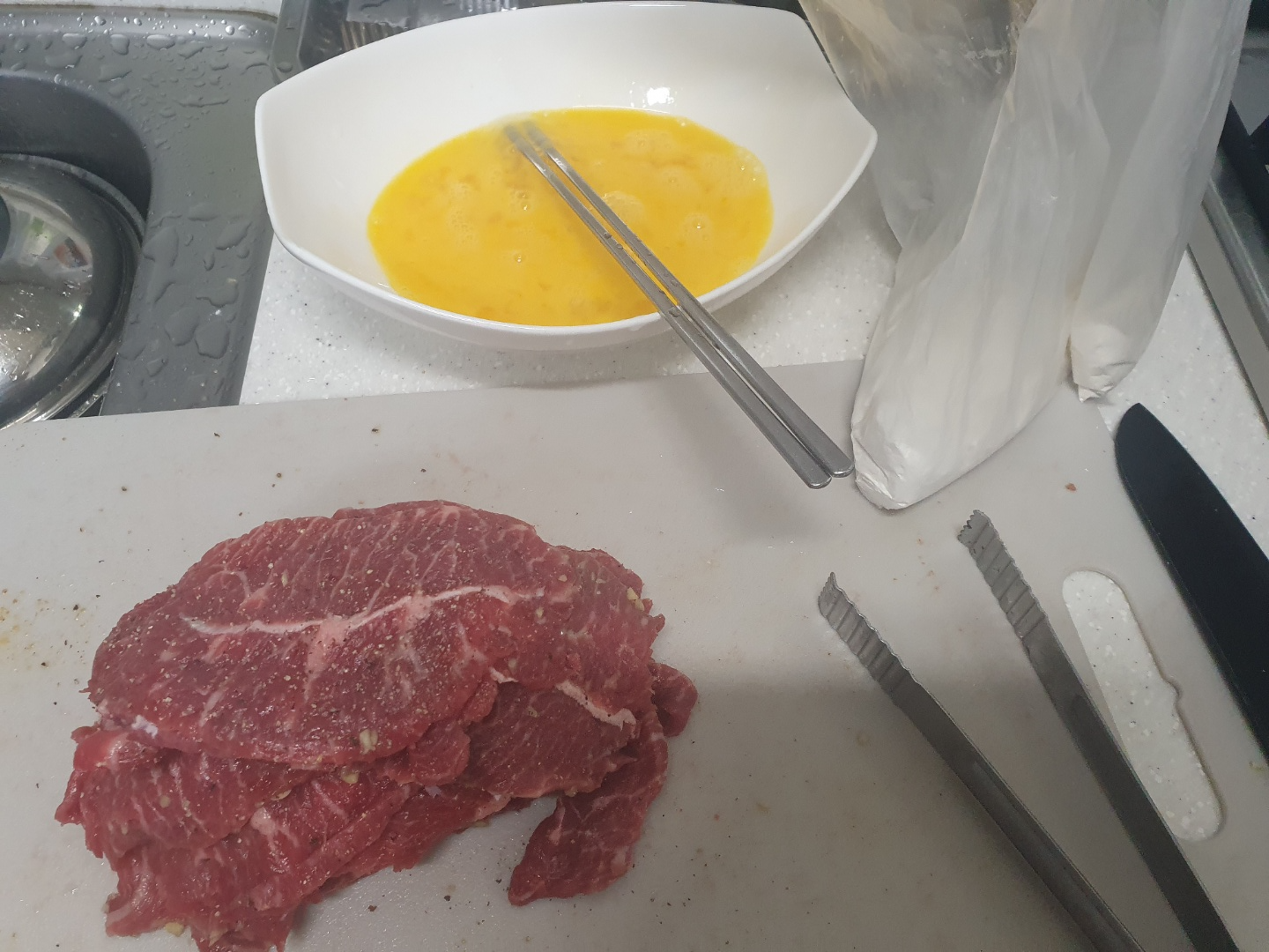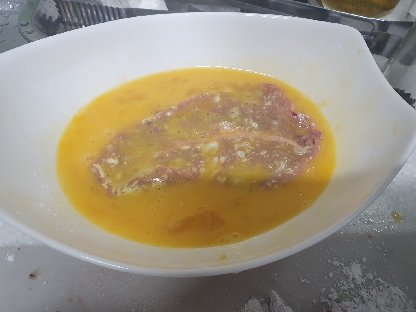 가루가 달라붙은 고기에 계란물을 발라서 잘 달궈진 프라이팬에 넣습니다.