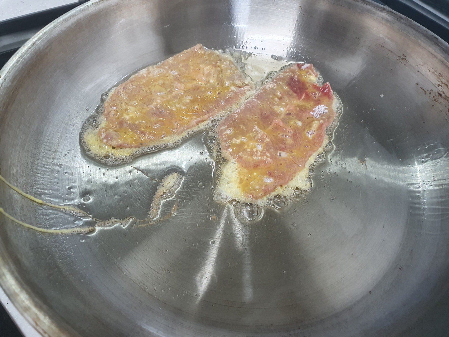 아무래도 계란물 밖으로 육즙이 흘러나오면서 기름이 좀 끈적해지니까 자주 닦아주면서 기름을 더 투입하는 게 좋습니다.