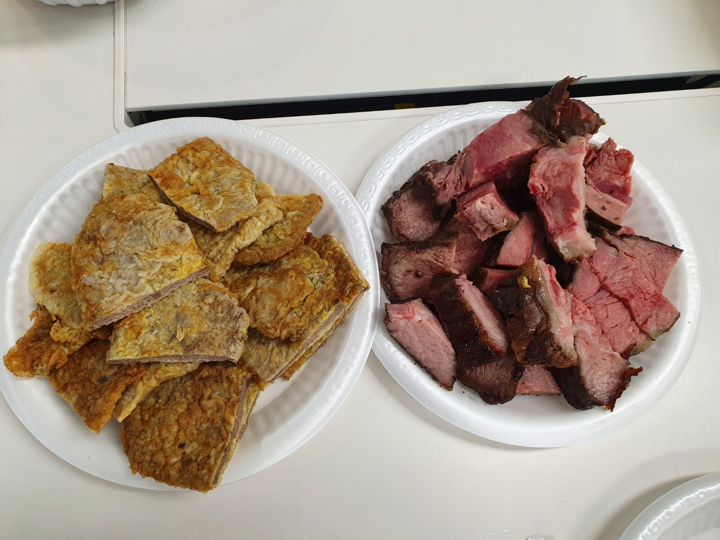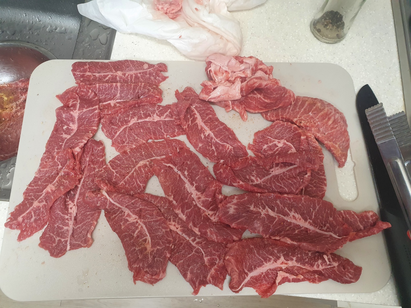 한쪽은 힘줄이 두껍고, 다른 쪽은 얇습니다. 힘줄이 두꺼운 부분은 칼로 잘 썰리지 않고, 힘줄이 잘 익지 않으니 얇은 부분만 얇게 썰어줍니다. 한 3mm 정도 두께로 썰었습니다. 손으로 썰다 보니 별로 균일하지 않습니다.