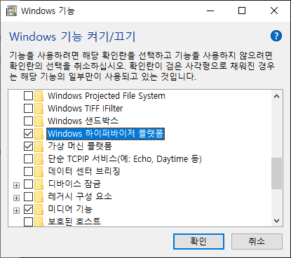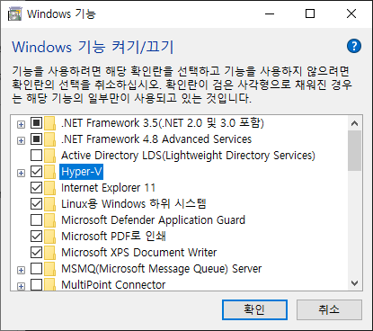 그리고 WSL 2를 사용하려면 Hyper-V도 함께 체크해야 합니다.