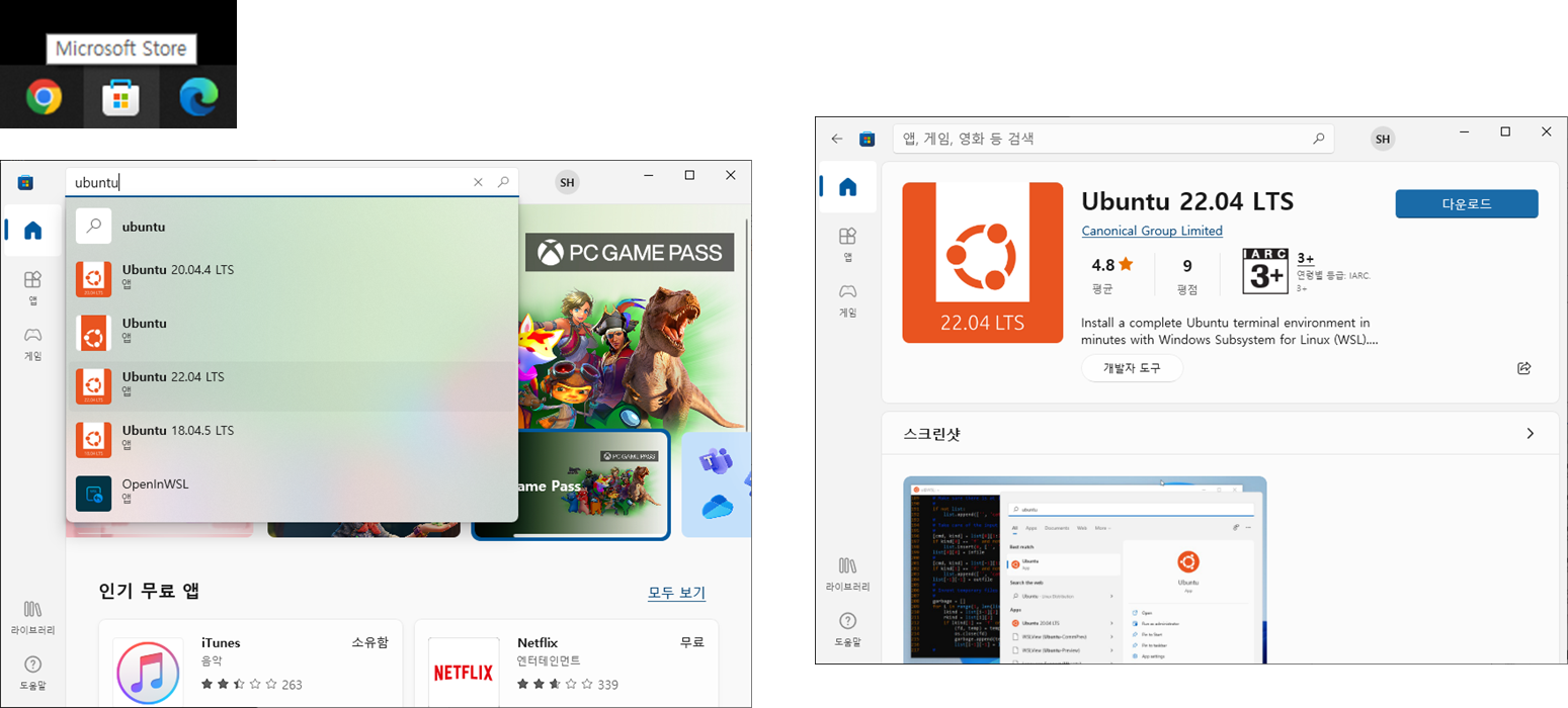 Microsoft Store -> ubuntu22.04 검색 ->다운로드