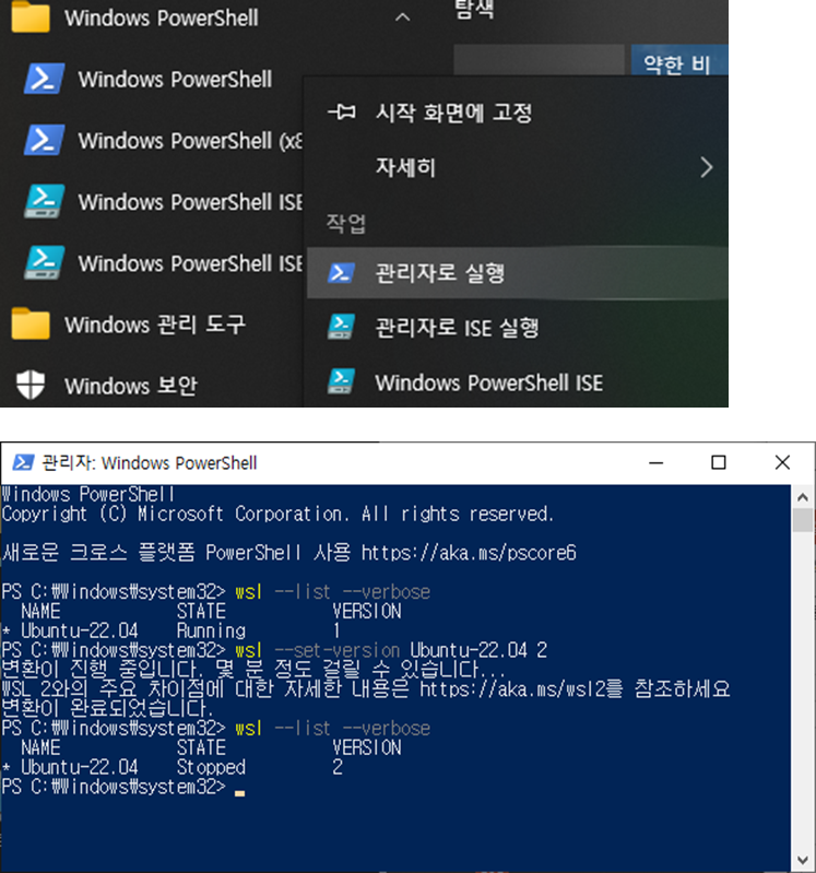 Windows PowerShell 을 관리자 권한으로 실행합니다.