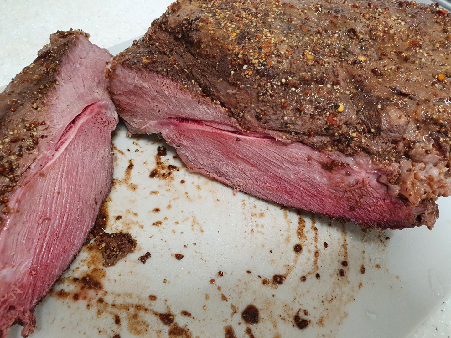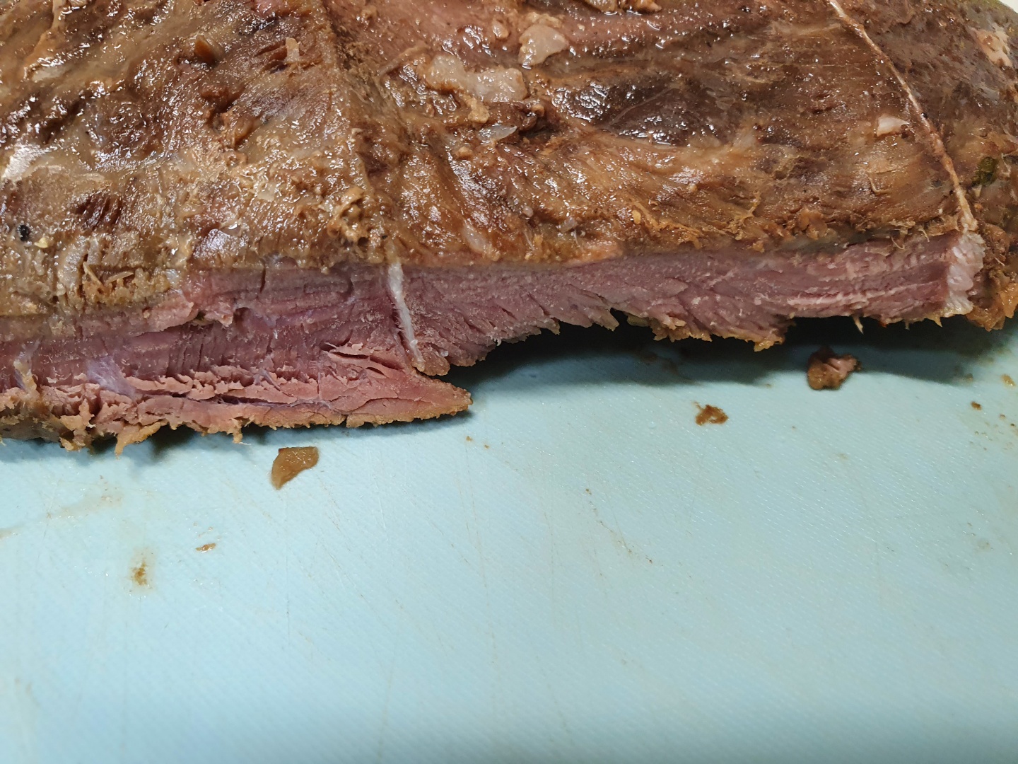 원래는 이후에 추가로 브리스킷처럼 심부온도를 90도 이상으로 올리면서 오래 구울까 했는데, 이상태로도 부드러워서 굳이 안 해도 되겠다 생각해서 이대로 끝냈습니다. 적당히 부드럽고 맛있었습니다. 로스트비프 같은 질감입니다.