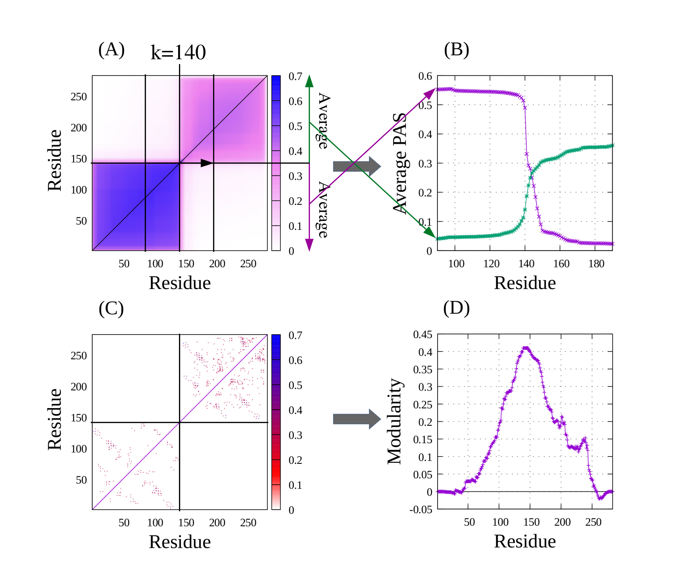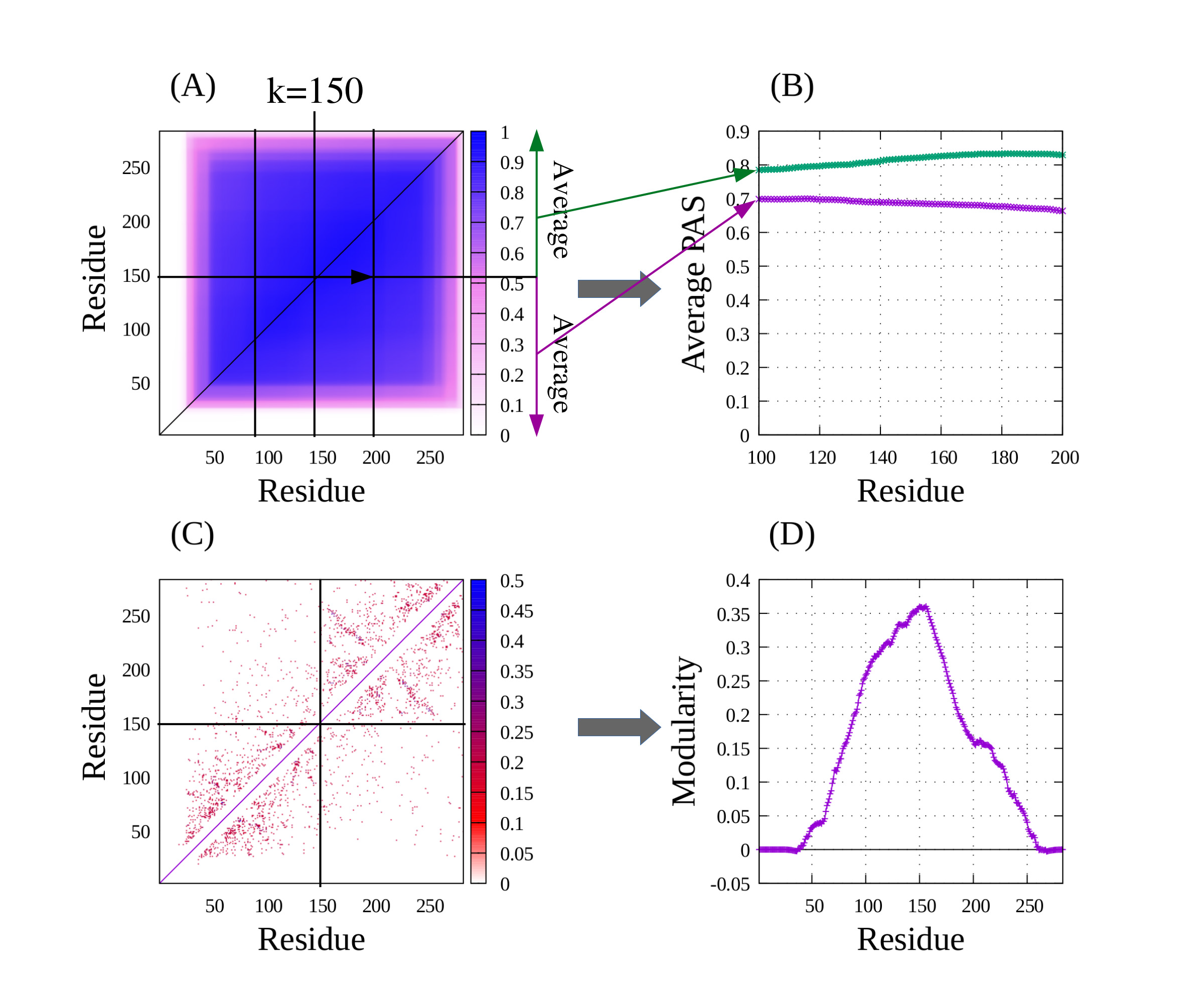 (D) 각 residue 를 기준으로 cluster를 나눴을 때의 modularity 값들을 계산한 것입니다. domain 경계 근처 modularity가 peak 인 것을 볼 수 있습니다.