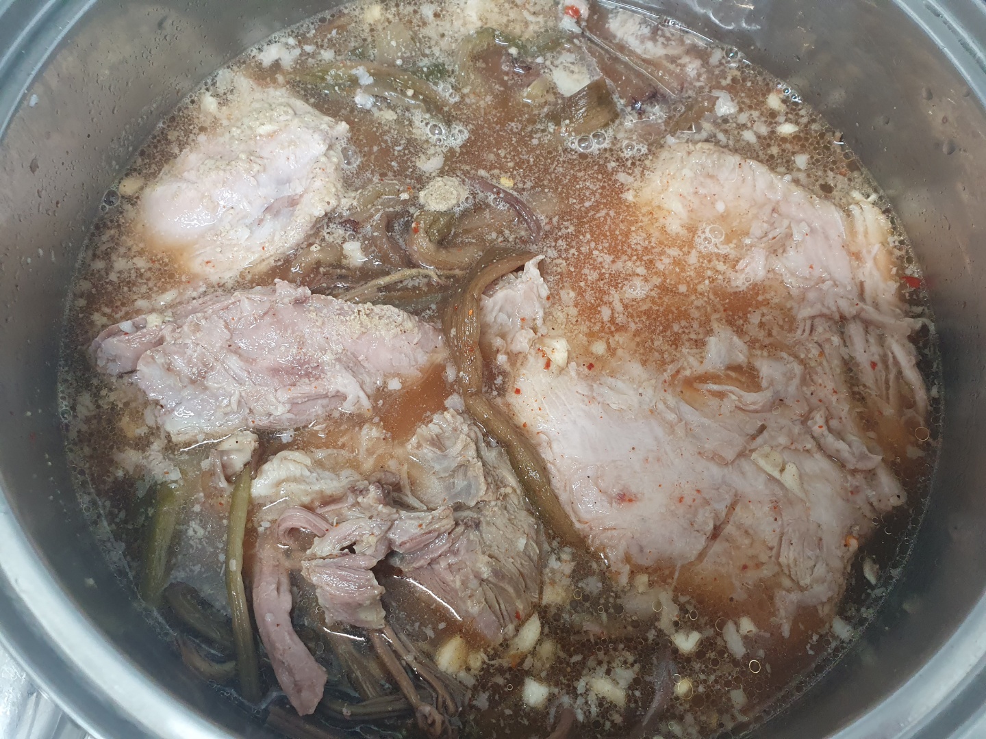 마늘, 무말랭이(...), 후추, 소금, 향신료 조금 넣고 한시간 좀 넘게 삶은 거 같은데, 매우 잘 삶아졌습니다. 고기는 부드럽고 뼈가 쏙 뽑히고 국물도 진합니다.