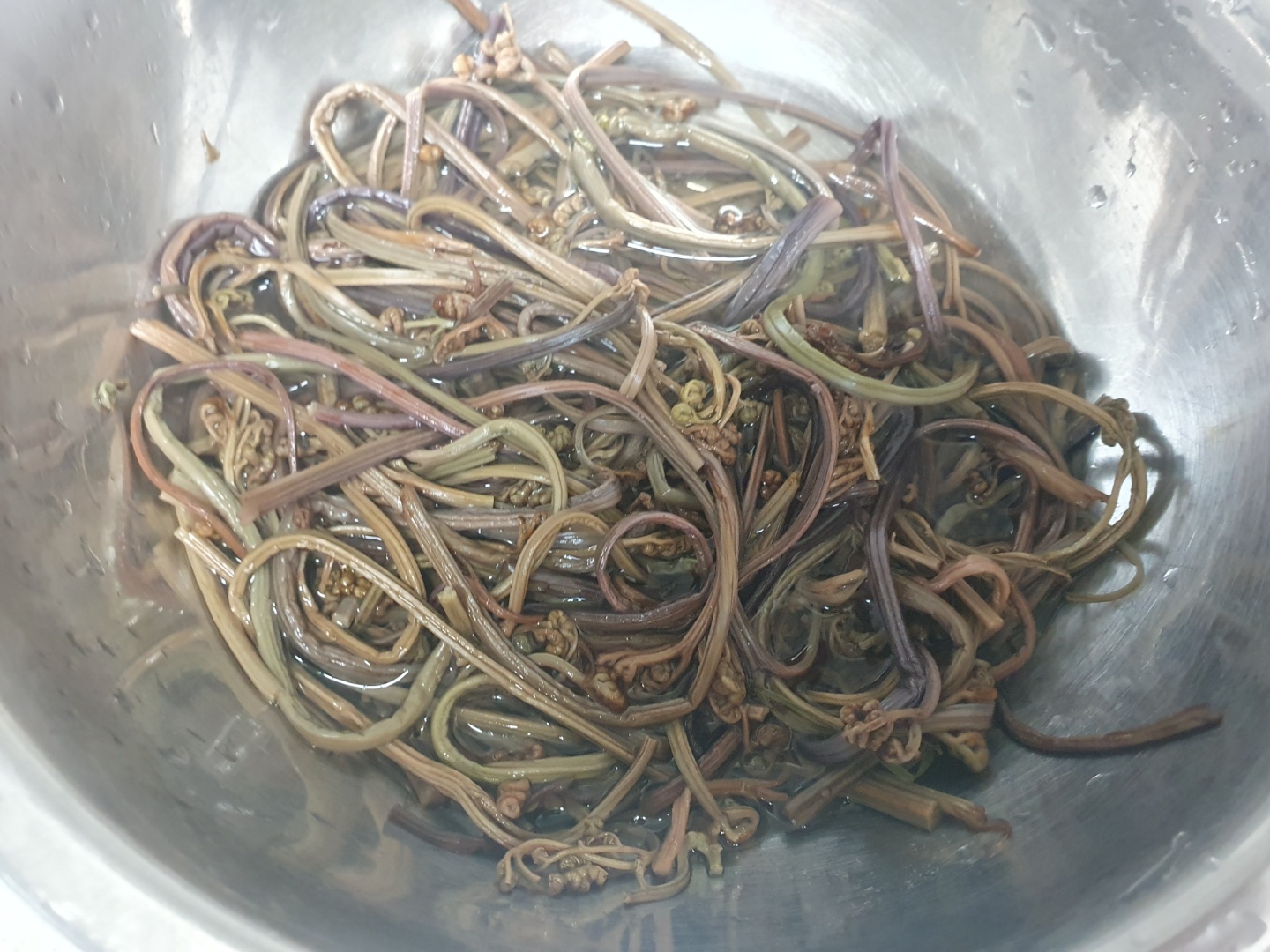 말린 토란과 말린 고사리를 밤새 불렸습니다. 원래는 갈비로 감자탕을 만들고 싶었는데, 우거지가 없고 제주도에서 사 온 고사리만 있어서 그냥 돈개장을 만들었습니다. 불린 후에 소금물에 삶고 물을 버리고 다시 물에 담가줍니다. 이과정을 2~3번 반복했습니다. 푹 무르고 아린 맛이 안 나올 때까지 합니다. 제대로 안 하면 못 먹을 물건이 될 수도 있습니다.
