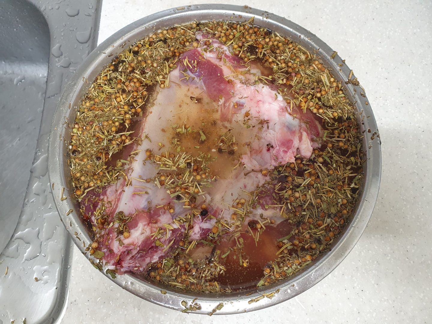 물에 돼지갈비와 향신료와 소금을 넣고 2시간 정도 염지를 했습니다.