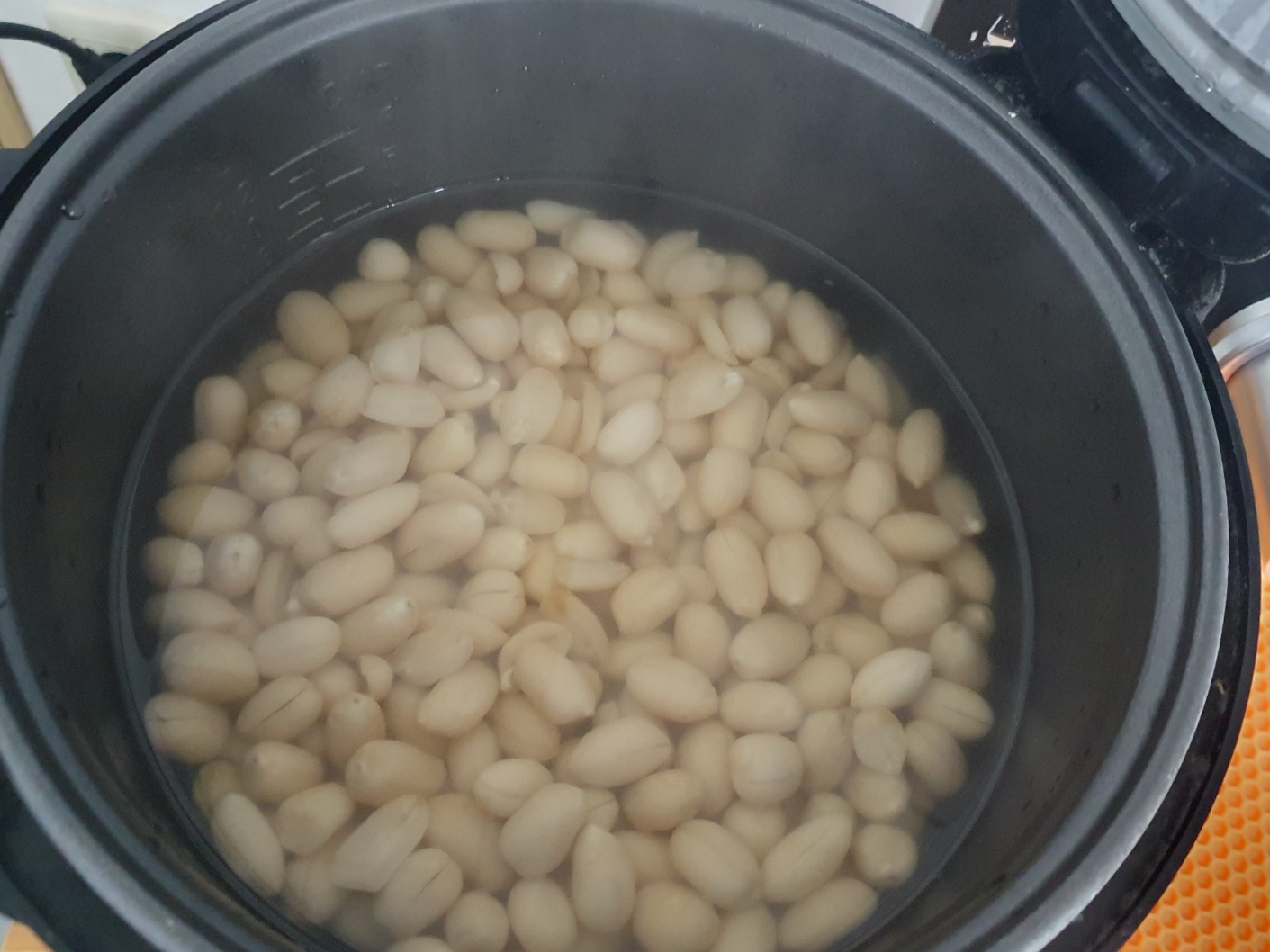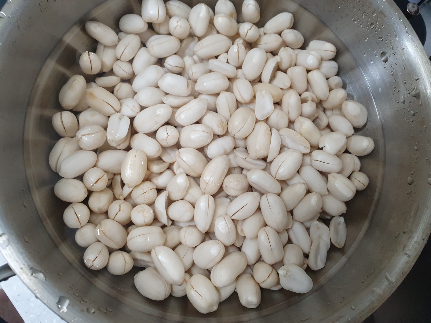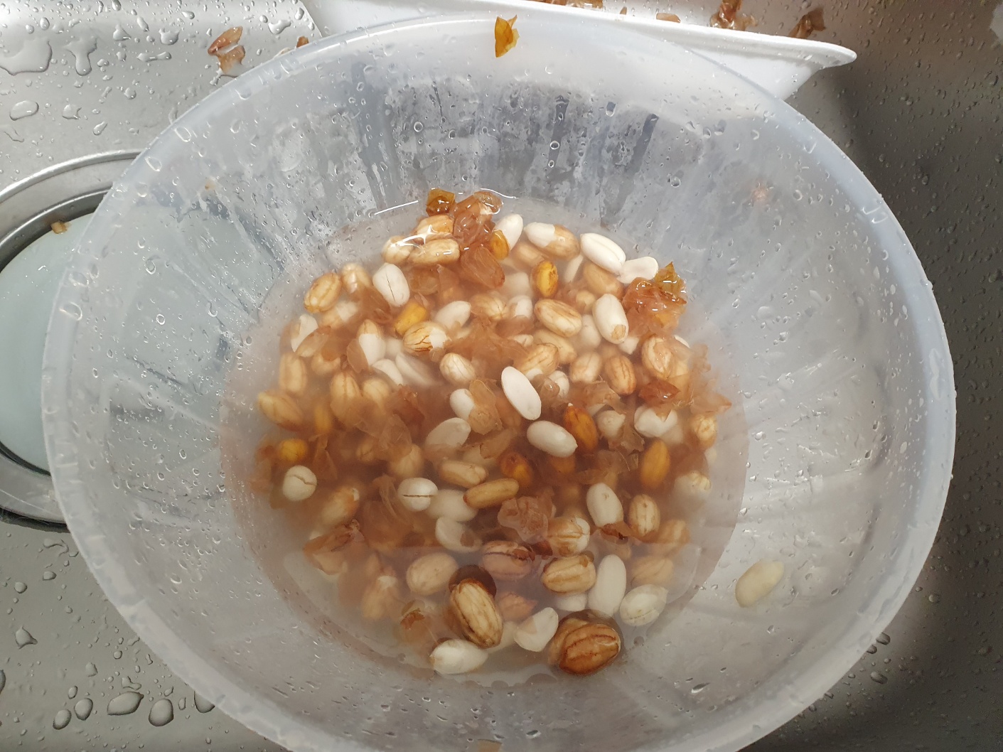 일단 집에서 안먹고 방치되고 있던 생땅콩입니다. 반나절정도 물에 불리고 껍질을 깠습니다. 물에 불면 껍질이 분리되기는 하는데, 그래도 까기 힘듭니다. 소쿠리에 담고 힘줘서 누르면 마찰로 벗겨집니다.