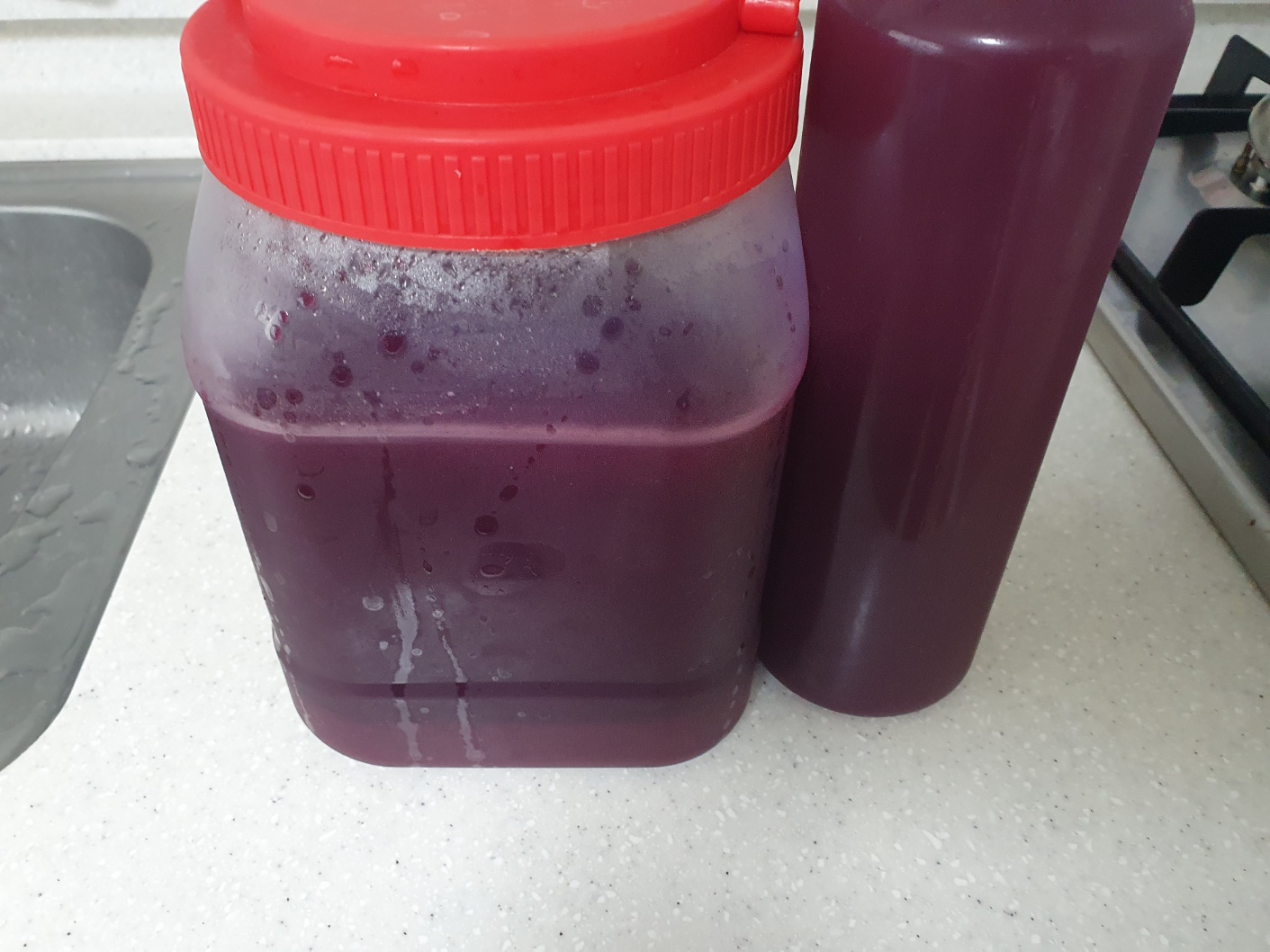 세척하고 알을 떼서 통에 담고 짓누르고 건더기를 걸러서 주스를 만들었습니다.