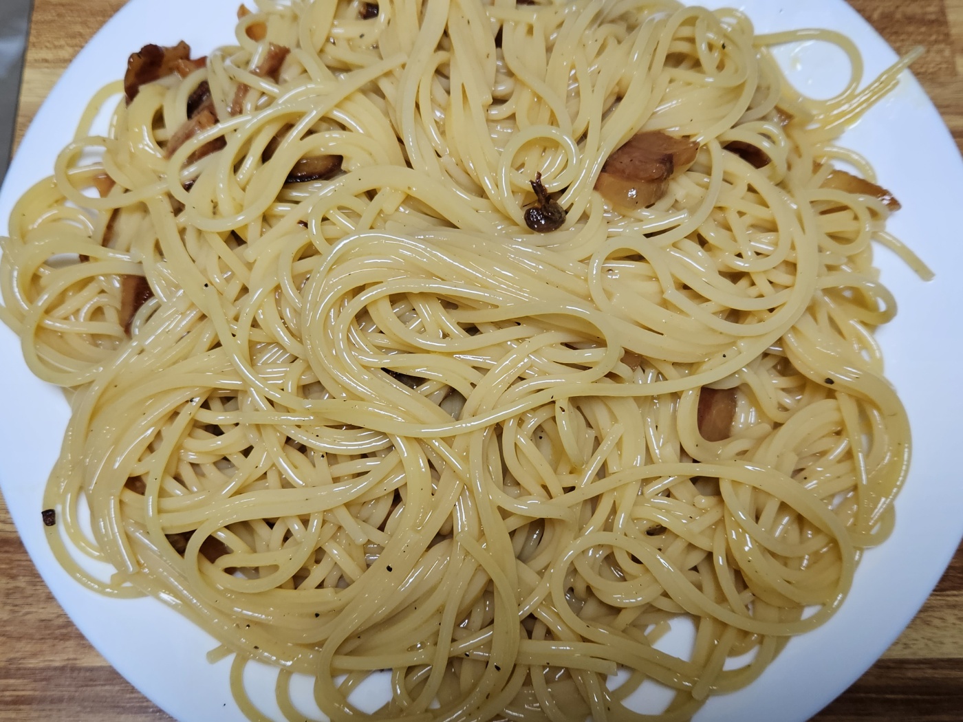 다 구웠으면 삶은 파스타를 팬에 넣고 기름에 섞어줍니다. 만약 팬에 기름이 너무 많으면 키친타월로 제거해도 됩니다.