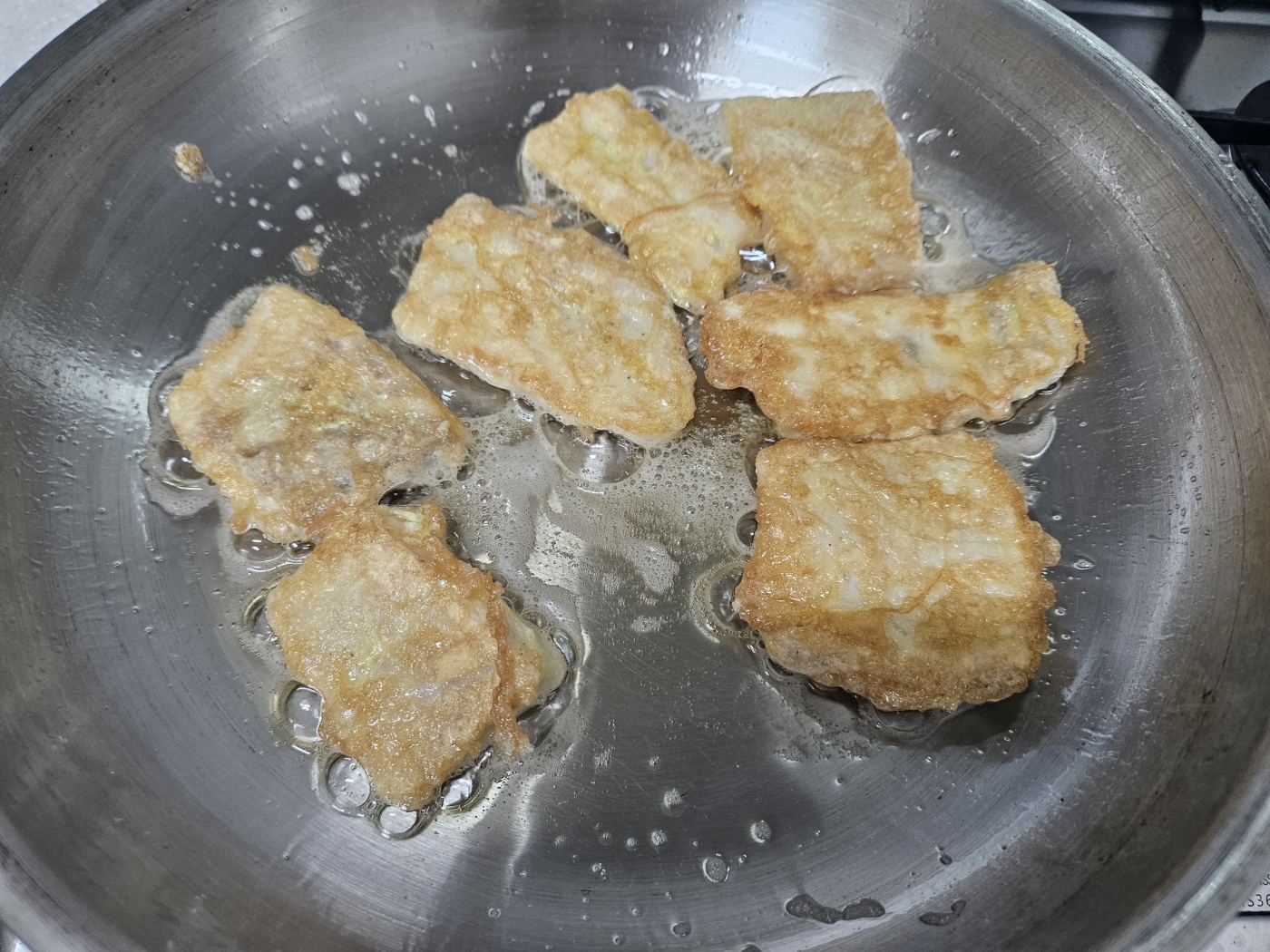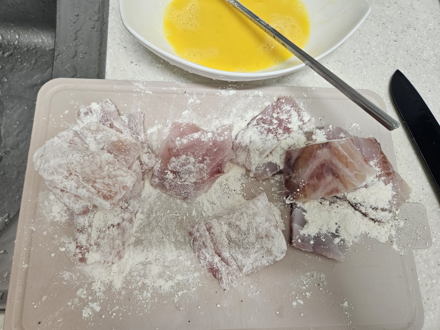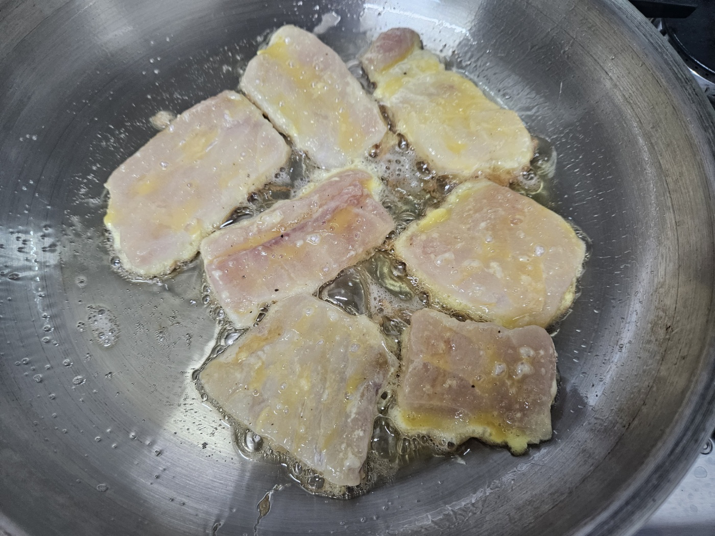 뭐 별거 있습니까... 민어 적당히 썰고 밀가루 하고 계란 발라서 프라이팬에 기름 잔뜩 넣고 구우면 됩니다.