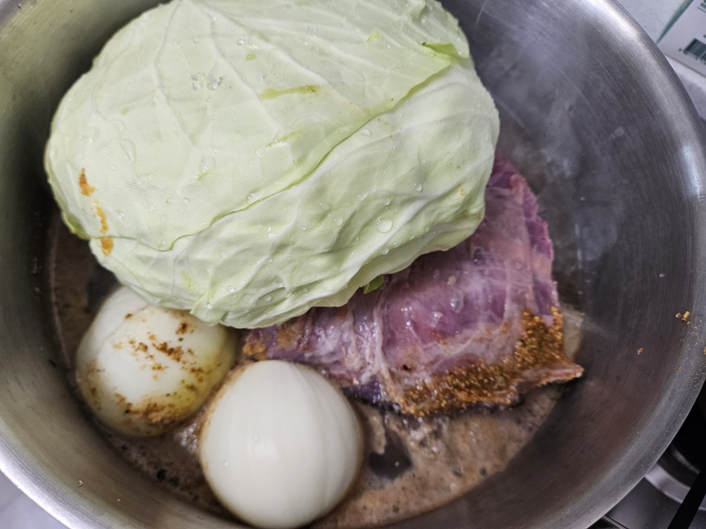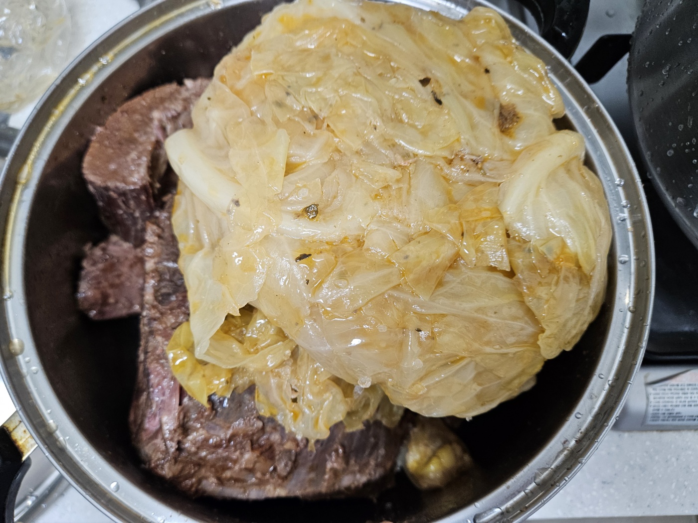 남은 고기는 삶았습니다. 양배추 한 통, 양파 2개, 각종 향신료 잔뜩, 토마토 주스 한 컵 정도?