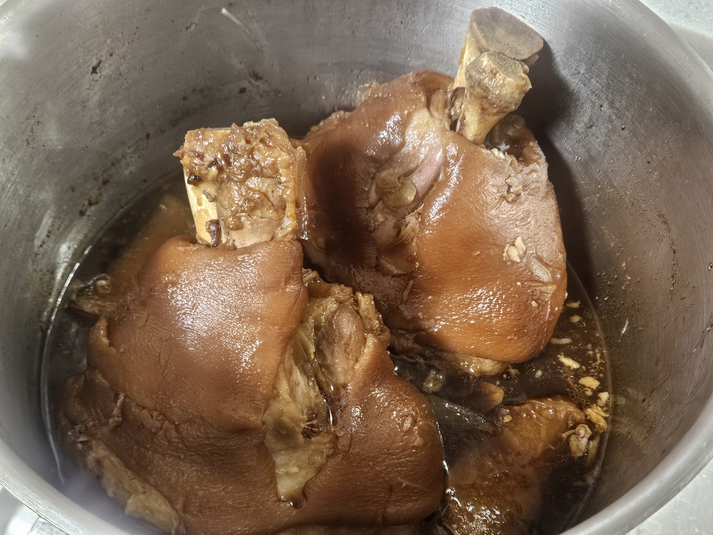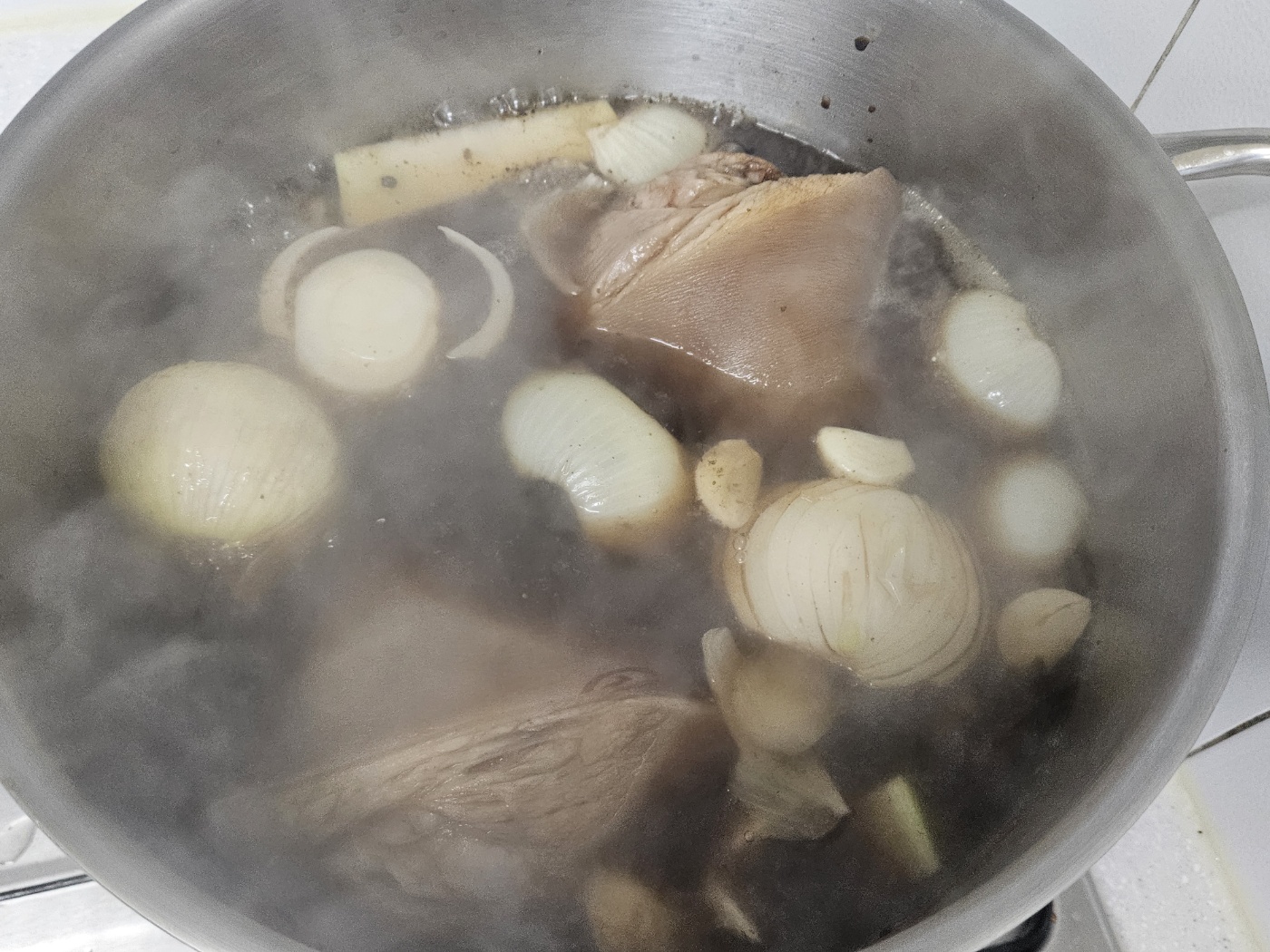 냄비에 족발, 향신료 끓인 물, 양파, 마늘, 생강, 무를 넣고 물이나 맥주를 붓고 2시간 정도 삶습니다.