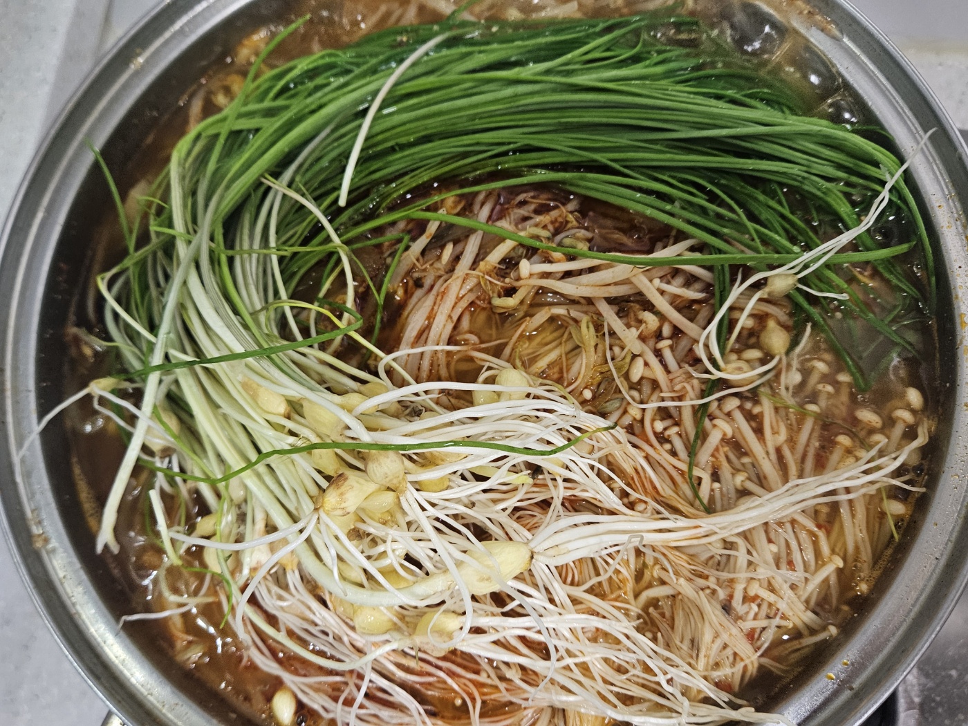 적당히 삶아지면 팽이버섯, 숙주나물, 달래를 넣습니다.