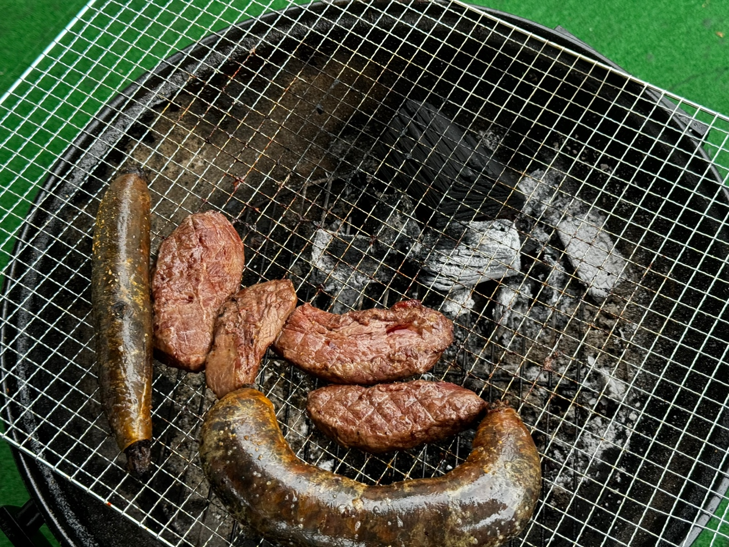고기를 구울 때는 불이 직접 닿는것을 피하도록 숯을 한쪽에 미뤄두고 뚜껑을 덮어서 열로 익히면 잘 타지 않습니다.