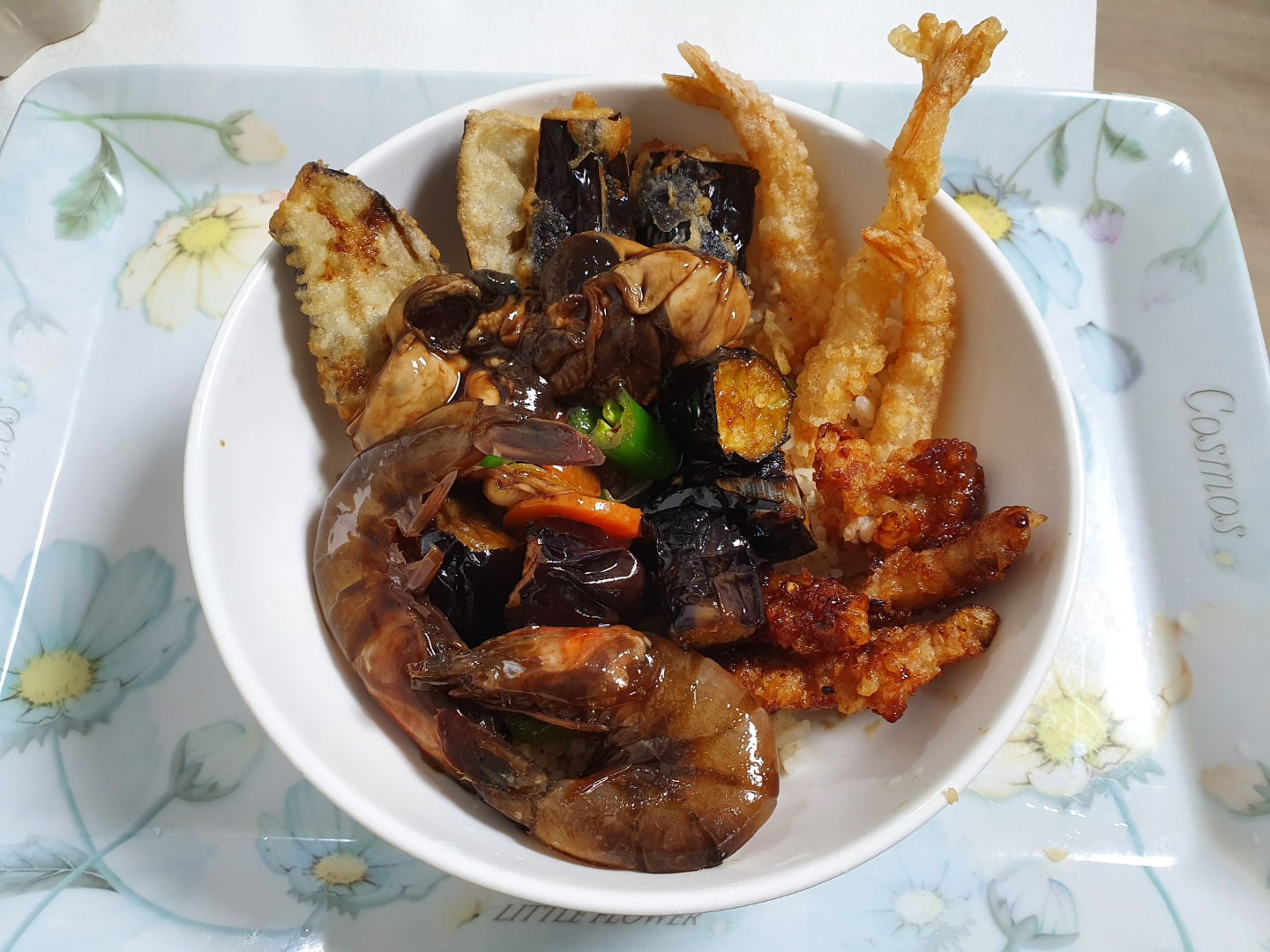 새우, 게, 돼지 등심, 닭고기, 버섯, 굴, 가지 튀김
