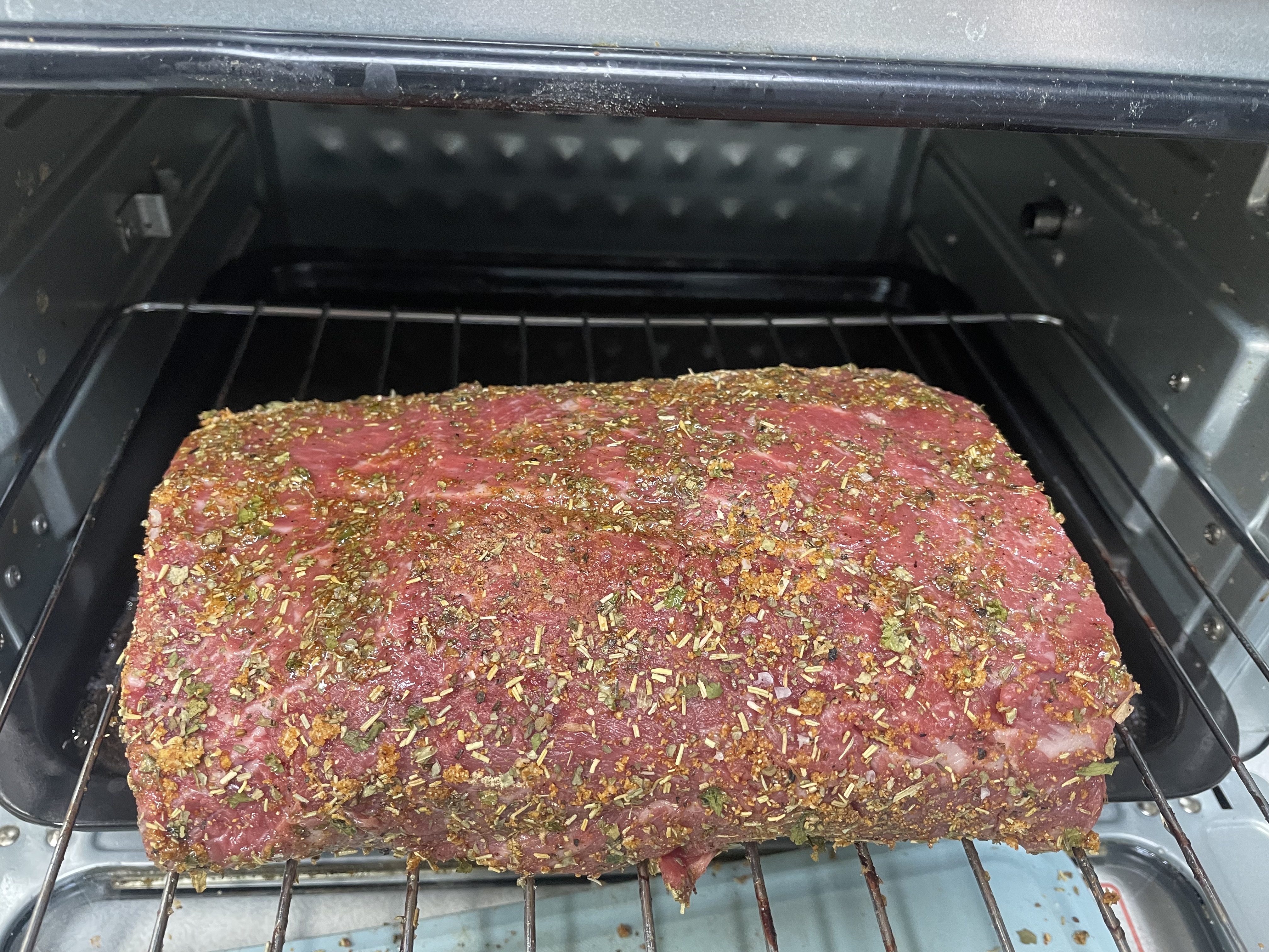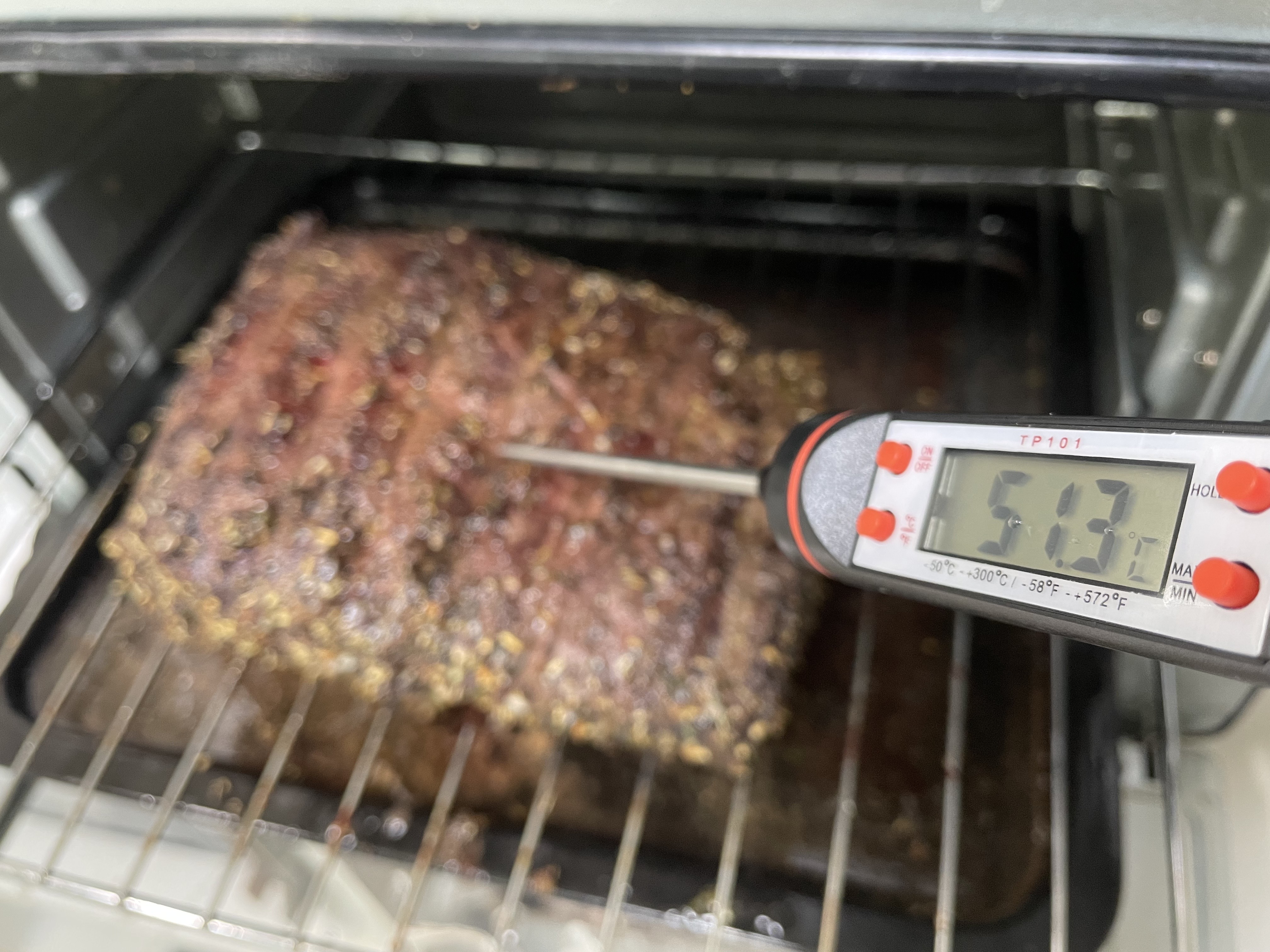 컨벡션 오븐을 사용해서 110도에서 2번 뒤집어가며 1시간 반 정도 구워줬습니다. 심부온도는 51도였습니다.